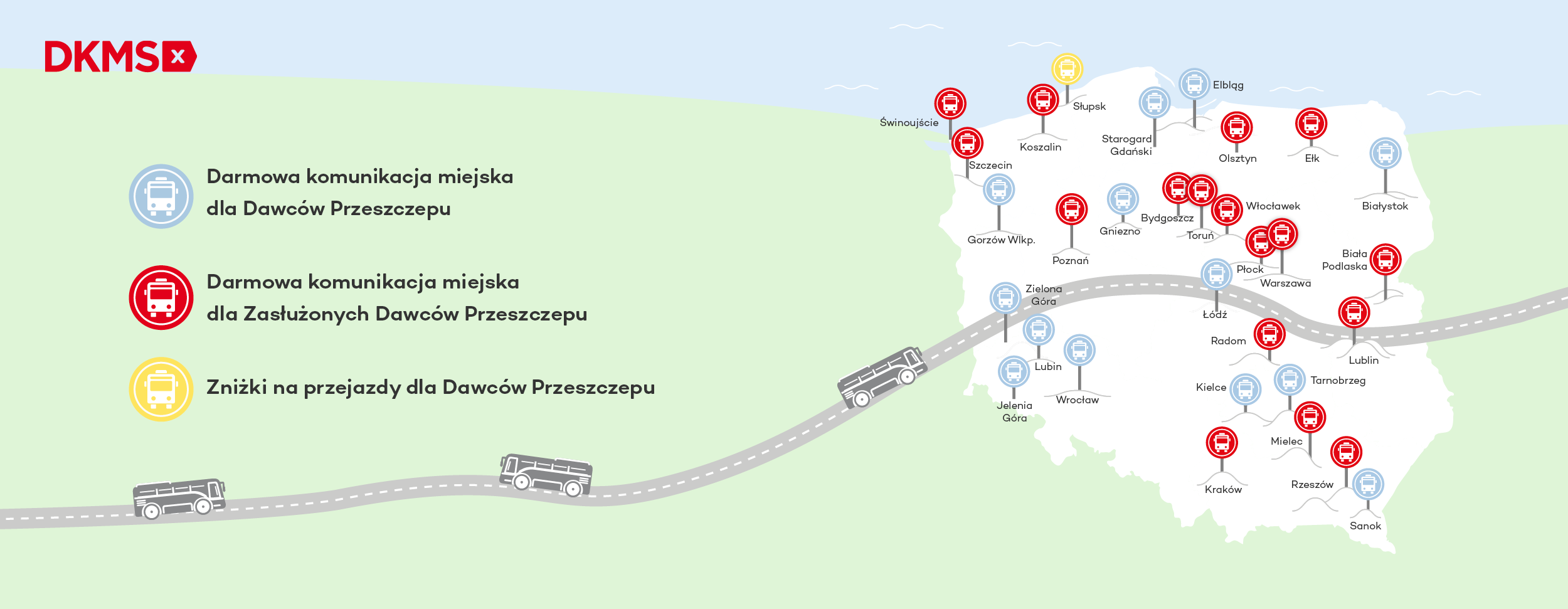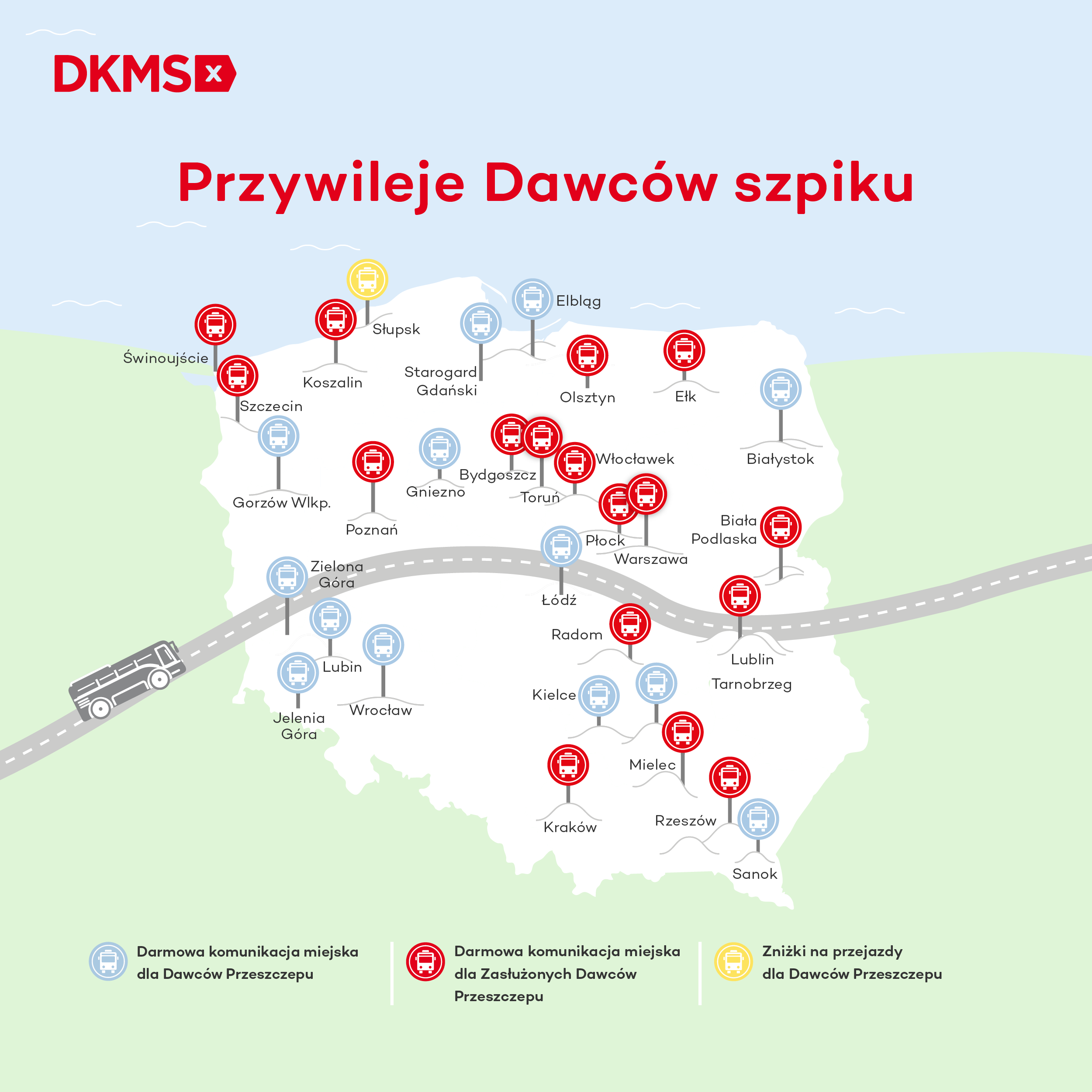 Chociaż nie we wszystkich miastach dawcy komórek macierzystych i szpiku mogą korzystać z bezpłatnej komunikacji miejskiej, ta lista stale się rozszerza. Zasłużony Dawca Przeszczepu bezpłatnie skorzysta z komunikacji miejskiej np. w Toruniu, Bydgoszczy i Włocławku.
